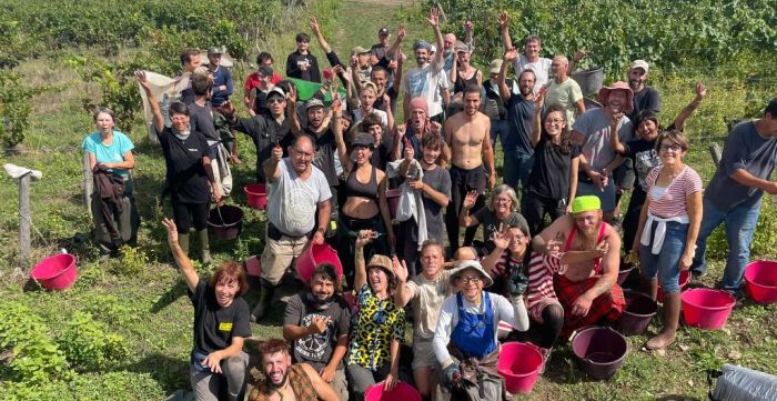 On Saturday the 23rd, we started with parcels that would go into La Pépie, the bulk of the harvester's work. Our trucks filled up quickly with grapes, which were driven to the estate and pressed immediately. By the 25th, the picking team grew as all the people who couldn't get make it earlier due to preexisting vacation plans joined. We were now 57 in the vines to keep picking grapes for La Pépie. The bunches were just as nice as in Briords. In the cellar, the first odors of fermentation became perceptible, with Briords bubbling at the surface.